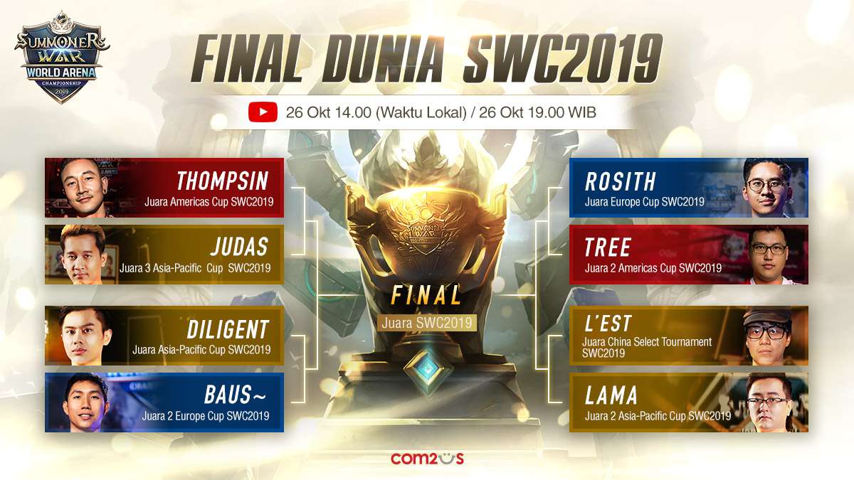 Final Dunia SWC 2019 akan disiarkan langsung pada tanggal 26 Oktober dari Channel YouTube Official Summoners War E-Sports (https://www.youtube.com/c/SummonersWarEsports).