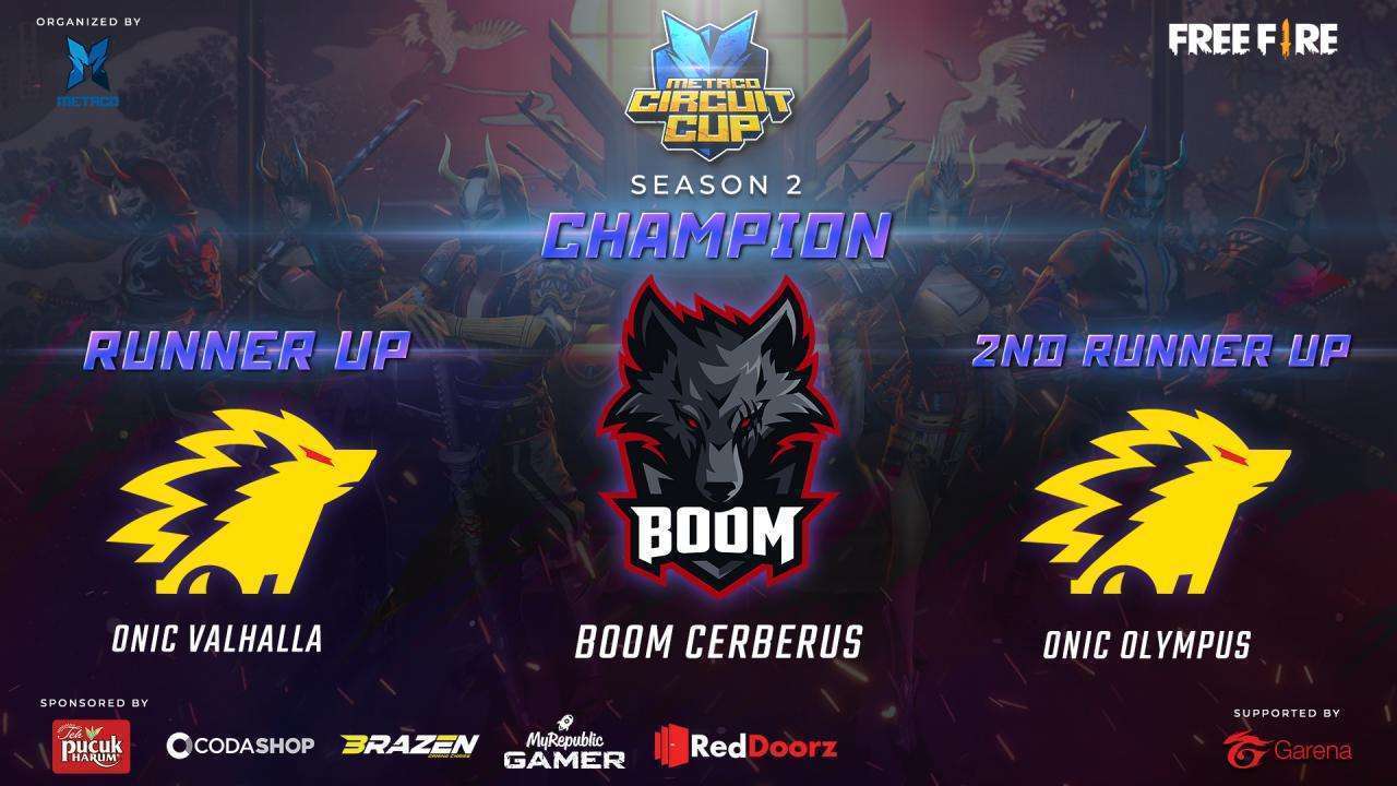 Grand final turnamen Free Fire Metaco Circuit Cup Season 2 akhirnya berlangsung tanggal 19 Oktober 2019 lalu. Sebanyak 12 tim Free Fire terbaik dari seluruh Indonesia bertemu dan menyajikan lima game yang sengit dan menegangkan. Tapi pada akhirnya BOOM Cerberus yang keluar sebagai juara.