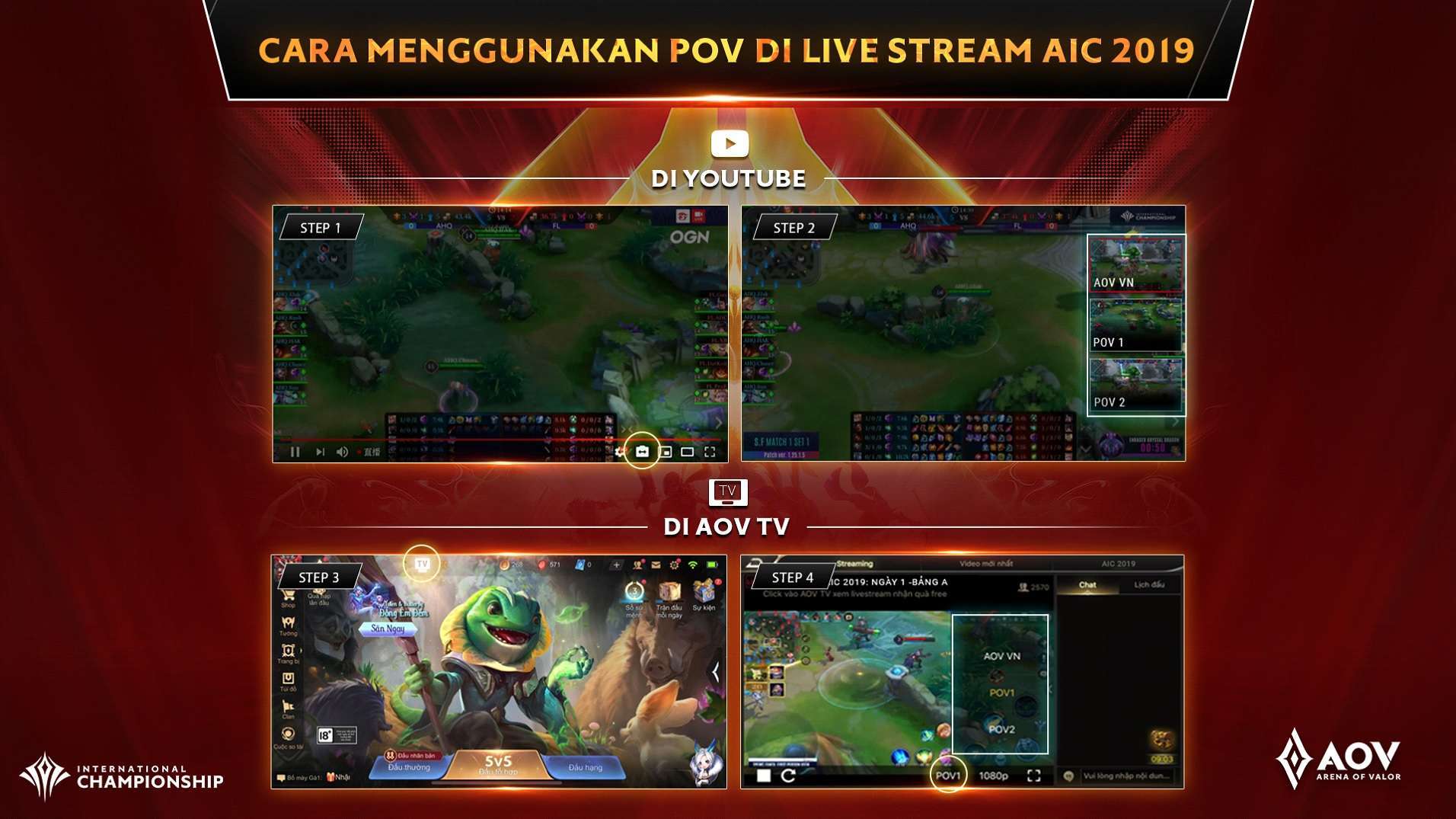 Untuk meningkatkan keseruan dalam menyaksikan pertandingan AIC 2019, terdapat fitur Player Point of View (POV) yang bisa kalian gunakan dan melihat secara langsung bagaimana para Pro Player bermain di turnamen internasional. Ikuti langkah-langkah berikut untuk menggunakan fiturnya saat menonton Live Streaming AIC 2019.