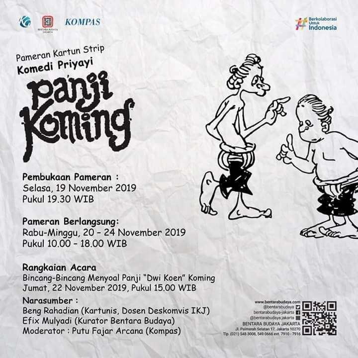 Panji Koming, sosok karakter komik satir ini sudah tidak asing lagi bagi para pembaca surat kabar Kompas Minggu. Pada tanggal 20 hingga 24 November 2019, Bentara Budaya Jakarta menggelar pameran bertajuk Pameran Kartun Dwi Koen “Komedi Priyayi Panji Koming”. Dalam pameran yang juga diselenggarakan hampir bersamaan dengan peringatan 1000 hari wafatnya sang komikus, Dwi Koendoro ini, pengunjung dapat melihat sejumlah komik-komik Panji Koming dari masa ke masa, yang membentang dari tahun 1979 hingga 2019, lengkap dengan substansinya yang mengangkat problema-problema terkini pada zamanya.