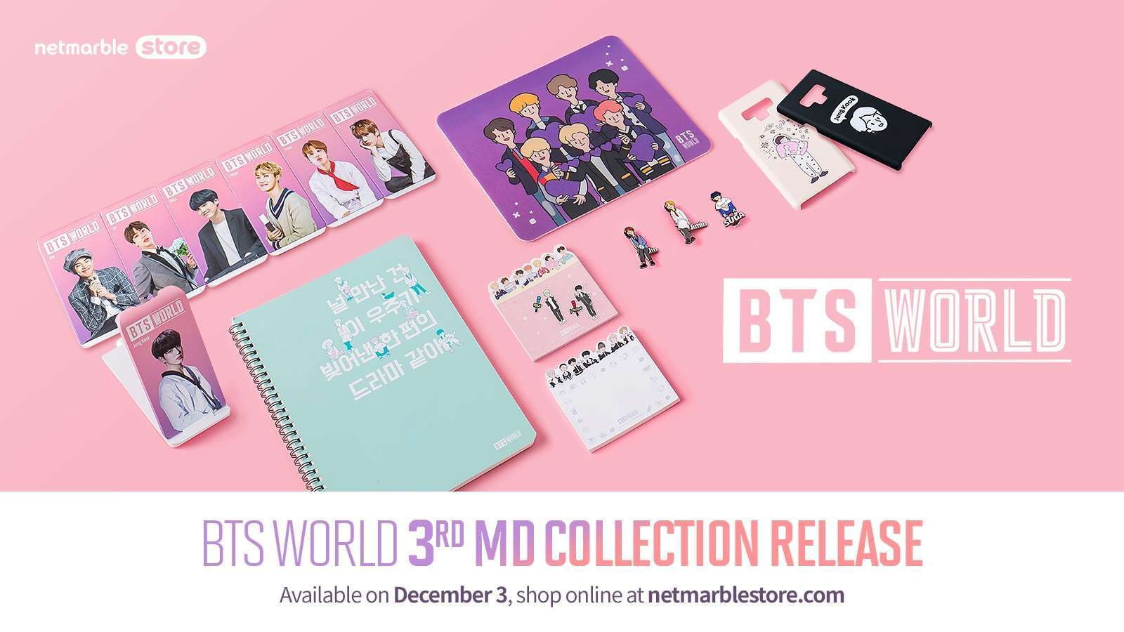 Netmarble mengumumkan bahwa koleksi merchandise BTS World part 3 telah hadir di Netmarble Online Store sejak 3 Desember pukul 8:30 WIB. Koleksi merchandise terbaru dari game ini terdiri dari high-speed wireless charging cradle, pin badge, memo pad, ruled notebook, sticker, mouse pad, masking tape, dan phone case. BTS World high-speed wireless charging cradle hadir dengan foto asli dari member BTS dan mampu melakukan pengisian cepat menggunakan output 9V. Netmarble berencana untuk terus memperkenalkan produk yang baru dan beragam dari game ini melalui Netmarble Online Store.
