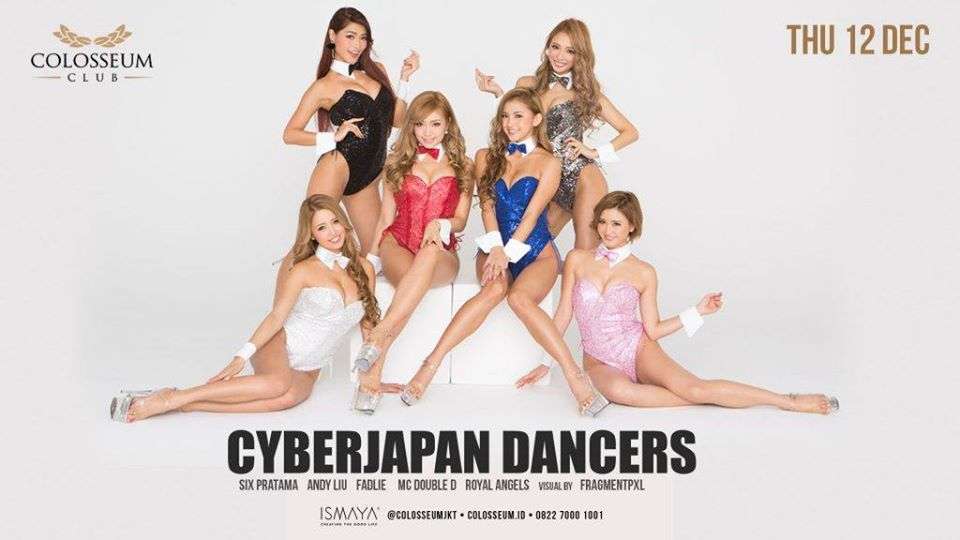 CYBERJAPAN DANCERS, grup penari Go-Go asal Jepang ini akan manggung di Indonesia. Adalah Colosseum Jakarta dan Ismaya Live yang akan membawa grup dansa asal Jepang ini untuk manggung di Jakarta pada hari Kamis, tanggal 12 Desember 2019 mendatang, bertempat di Colosseum Jakarta. Pengunjung akan diajak untuk berdansa semalam suntuk dari pukul pukul 21.30 hingga 03.00 WIB.