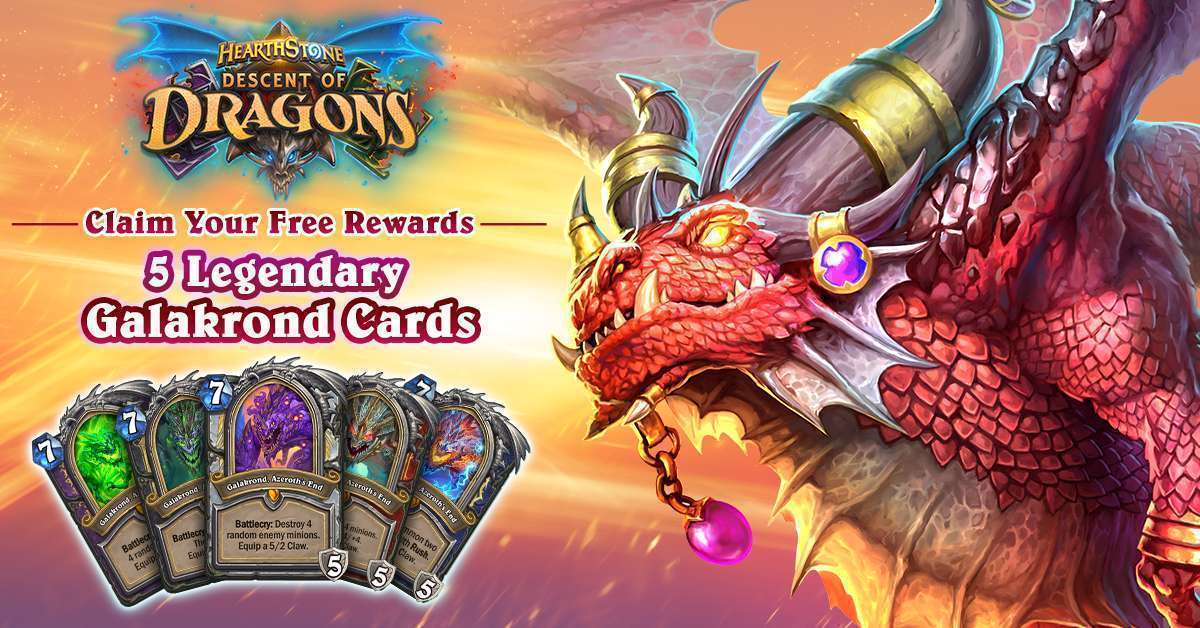 Mulai hari ini, pemain Hearthstone yang log in akan mendapatkan tiga card pack Descent of Dragons dan lima kartu hero Galakrond gratis, Bersama dengan dua minion neutral Shield of Galakrond dilengkapi dengan efek Invoke.* Pemain juga dapat mengumpulkan beragam hadiah yang epic setelah menyelesaikan enam seri quest Legendaris—lima card pack Descent of Dragons tambahan, dua card pack Rise of Shadows™, dua card pack Saviors of Uldum™, dan total 200 gold.