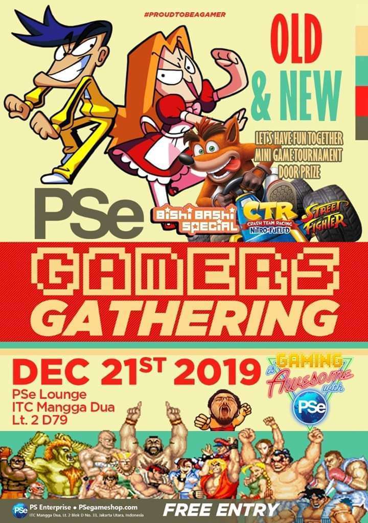 Pada tanggal 21 Desember 2019 yang lalu, PSenterprise mengadakan event gathering bagi para gamer dan komunitas gaming yang bertajuk PSe Gamer’s Gathering 2.0 : Old and New. Bertempat di PSe Lounge yang berada di pusat belanja elektronik ITC Mangga Dua Jakarta, acara ini menghadirkan beberapa kompetisi game dari lintas generasi, seperti Street Fighter II Turbo-nya SNES (Super Nintendo Entertainment System atau Super Famicom untuk di regional Jepangnya), CTR Nitro Fueled di konsol PlayStation 4 dan satu party game yang heboh di masanya karena konon game ini suka merusak controller stick, yaitu Bishi Bashi di konsol PlayStation (PSX). Di acara tersebut banyak dihadiri oleh peserta dari banyak kalangan, seperti gamer casual maupun gamer pro dan youtuber seperti Advance Guard dan Republik Sultan pun juga turut hadir memeriahkan acara ini.