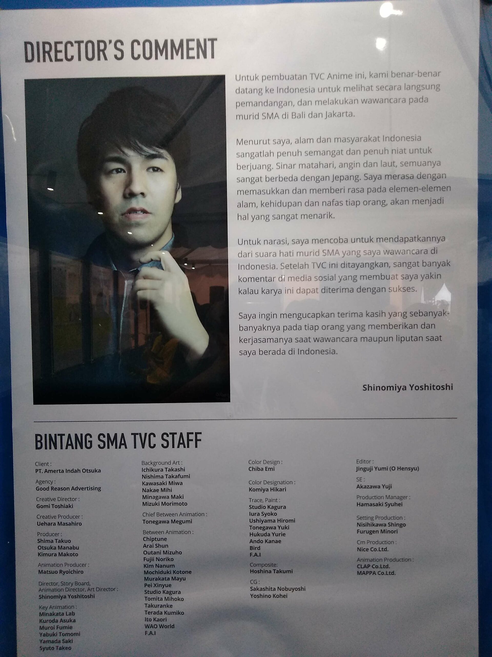 TVC POCARI SWEAT – Bintang SMA, iklan promosi dari Pocari Sweat ini sempat viral di jagat dunia maya. Pasalnya cuplikan iklan yang dihadirkan oleh Pocari Sweat, sebagai bagian dari acara mereka yang bertajuk Pocari Sweat Bintang SMA atau #BintangSMA ini ditampilkan dengan nuansa bergaya anime ala karya Makoto Shinkai. Iklan ini sendiri disutradarai oleh Yoshitoshi Shinomiya, seorang artis asal Jepang yang cukup banyak terlibat dalam sejumlah produksi anime, terutama dalam hal desain ilustrasi maupun background. Sejumlah anime yang pernah ia tangani di antaranya beberapa anime karya sutradara kenamaan Makoto Shinkai seperti Children Who Chase Lost Voices, The Garden of Words, hingga your name. Ia juga membuat sejumlah iklan bergaya anime sebagaimana iklan Pocari Sweat – Bintang SMA yang sempat viral itu, termasuk juga menggambar visual dari film layar lebar Pokemon. Beberapa anime yang juga turut ia kerjakan di antaranya adalah In This Corner of the World, Shoujo Shuumatsu Ryokou, Napping Princess, dan sejumlah judul lainnya.
