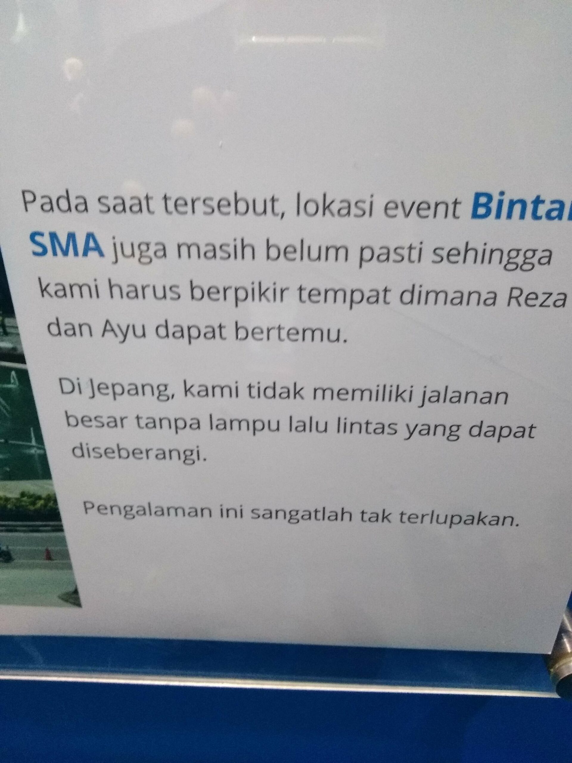 Karena saya bertemu anak muda di indonesia yg enerjik. Saya berpesan untuk para anak SMA di indonesia untuk terus semangat mengapai mimpinya.