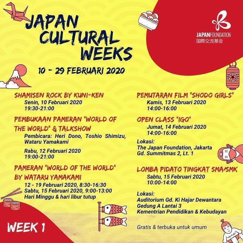 Tahun ini, Japan Cultural Weeks hadir mulai tanggal 10-29 Februari 2020 dengan menghadirkan beragam kegiatan seperti pertunjukan musik, lomba pidato Bahasa Jepang, pengenalan Bahasa Jepang, pameran seni rupa, workshop, pemutaran film, demonstrasi, hingga diskusi. Kegiatan ini dapat diikuti oleh masyarakat Indonesia khususnya Jakarta tanpa dipungut biaya.