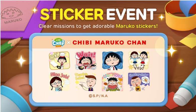 Sebagai bagian dari kolaborasi spesial ini, ada 8 buat stickers Chibi Maruko-chan yang dapat diunduh oleh pemain. Stickers ini tersedia dalam jumlah yang terbatas mulai 11 Februari pukul 11:00 AM hingga 10 Maret 2020 mendatang pukul 11:59 PM. Untuk informasi lebih lanjut bisa melihat pengumuman yang terdapat di dalam gim.