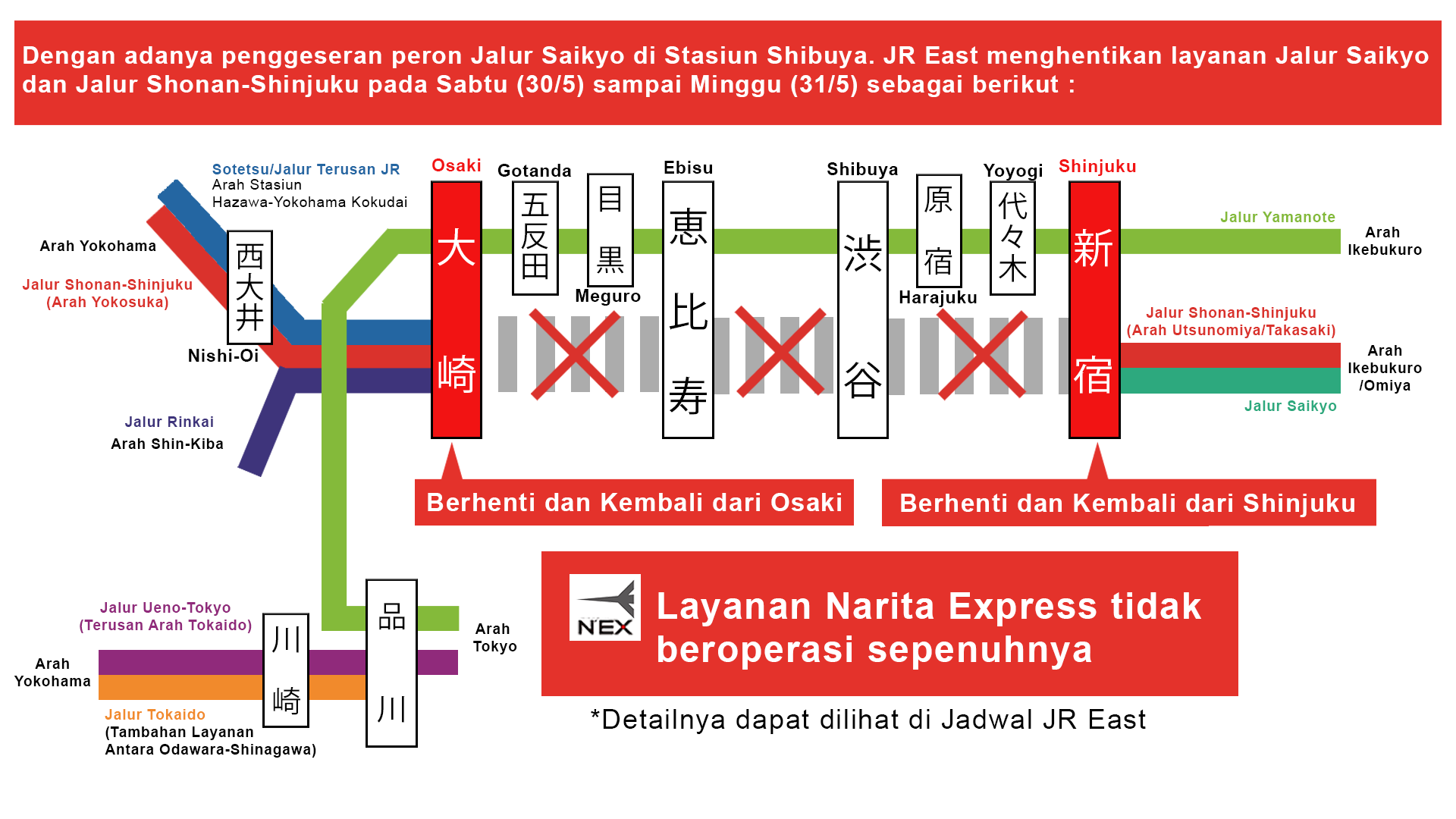 East Japan Railway Co. (JR East) selaku operator terbesar di wilayah Tokyo mengumumkan rencana perbaikan di area kendalinya. Perbaikan kali ini akan dilaksanakan di stasiun Shibuya, lebih tepatnya di peron jalur Saikyo. Oleh karena itu, JR East akan memotong relasi perjalanan kedua jalur yaitu jalur Saikyo dan jalur Shonan-Shinjuku.