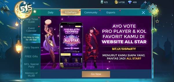 Jadi tunggu apa lagi? Segera klik link bit.ly/515PARTY atau masuk lewat banner di gim MLBB kamu dan tentukan pemain All Star yang akan bertanding di MLBB All Star Indonesia 2020!