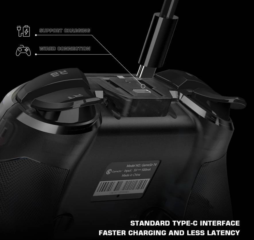 GameSir T4 Pro sudah dilengkapi dengan port Type C. Port ini bisa digunakan baik untuk mengisi daya gamepad ataupun untuk mengkoneksikan gamepad ke perangkat gaming dengan metode kabel.