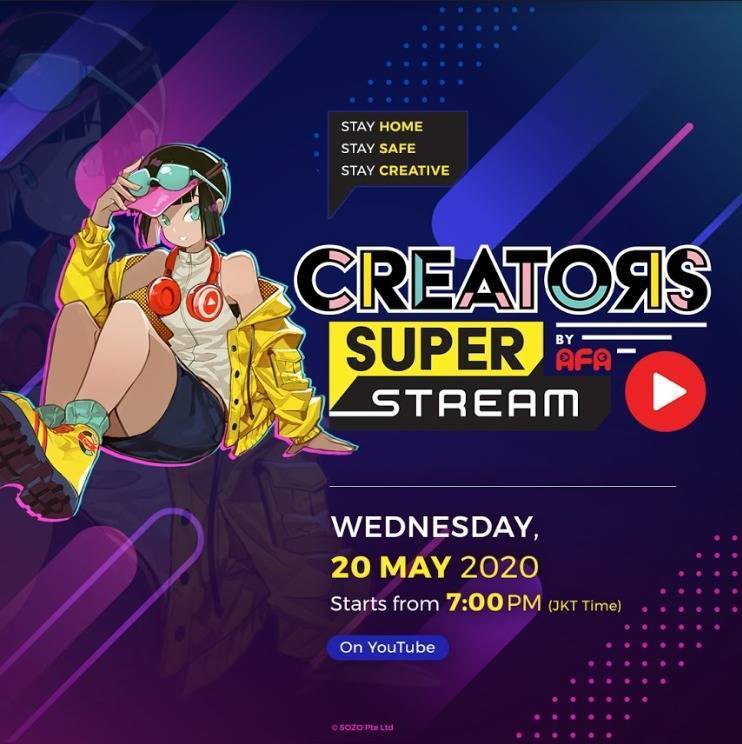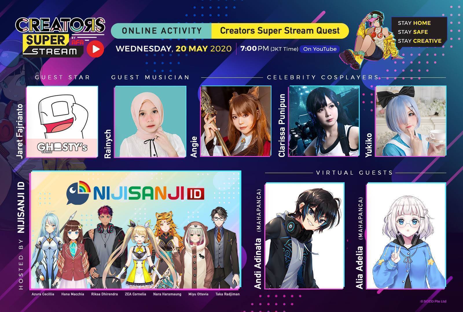 SOZO – sebagai penyelenggara Anime Festival Asia dan Creators Super Fest menghadirkan pengalaman baru secara online! Creators Super Stream akan menampilkan penayangan acara percobaan sepanjang 2 jam di tanggal 20 Mei 2020 di Youtube. Stream ini akan menghadirkan Jaret Fajrianto dari GHOSTY’s COMICS, Penyanyi Youtube Indonesia Rainych, cosplayer internasional Clarissa Punipun, Angie, Yukiko, serta virtual guest Andi Adinata dan Alia Adelia. Pertunjukan ini akan dipandu oleh NIJISANJI ID.