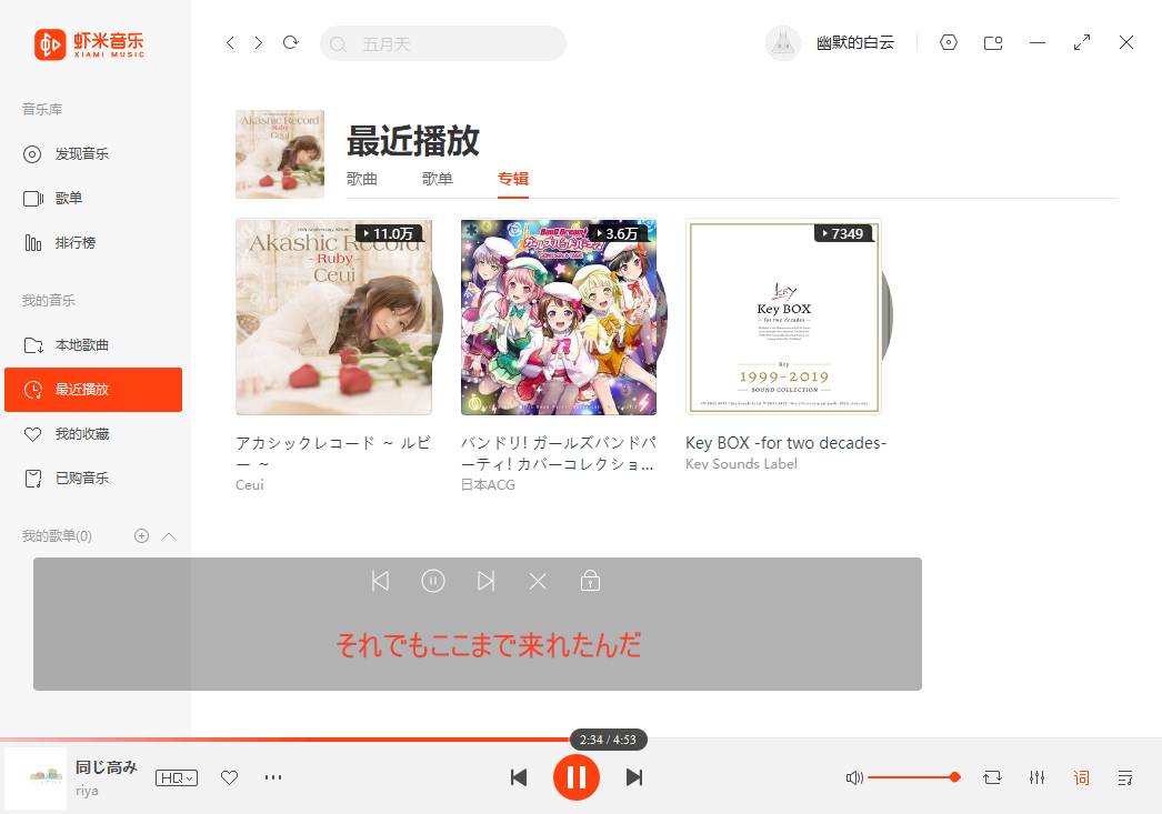 Koleksi-koleksi lagunya sangat lengkap. Para penggemar lagu galge akan dimanjakan tidak hanya dengan katalog yang lengkap dari masa lalu, namun juga kehadiran lagu-lagu rilisan terbaru. Saya mencari lagu Duca dan cukup senang karena bisa menemukan 月の彼方で逢いましょう (Tsuki no kanata de aimashou) yang notabene cukup baru (dirilis 2019). Atau menemukan lagu ending Rewrite, 闇の彼方へ (Yami no Kanata he). Kualitas playback juga bisa diatur. Pada level gratis, tersedia pilihan MP3 kualitas standar atau MP3 kualitas tinggi. Meskipun server Xiami Music berlokasi di Tiongkok, tampak tidak ada masalah berarti saat memutar lagu, dengan kecepatan tidak jauh berbeda dari Spotify.