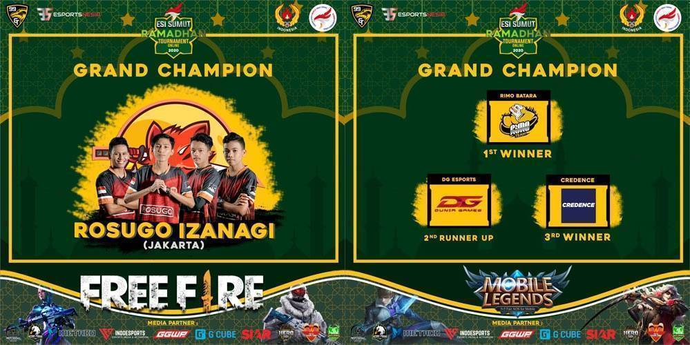 Dengan demikian, perolehan akumulasi poin tertinggi yang sekaligus menjadi pemenang dari ajang ESI Sumut Ramadhan Online Tournament Free Fire adalah ROSUGO IZANAGI, disusul oleh DG ESPORT dan SIREN ESPORT.