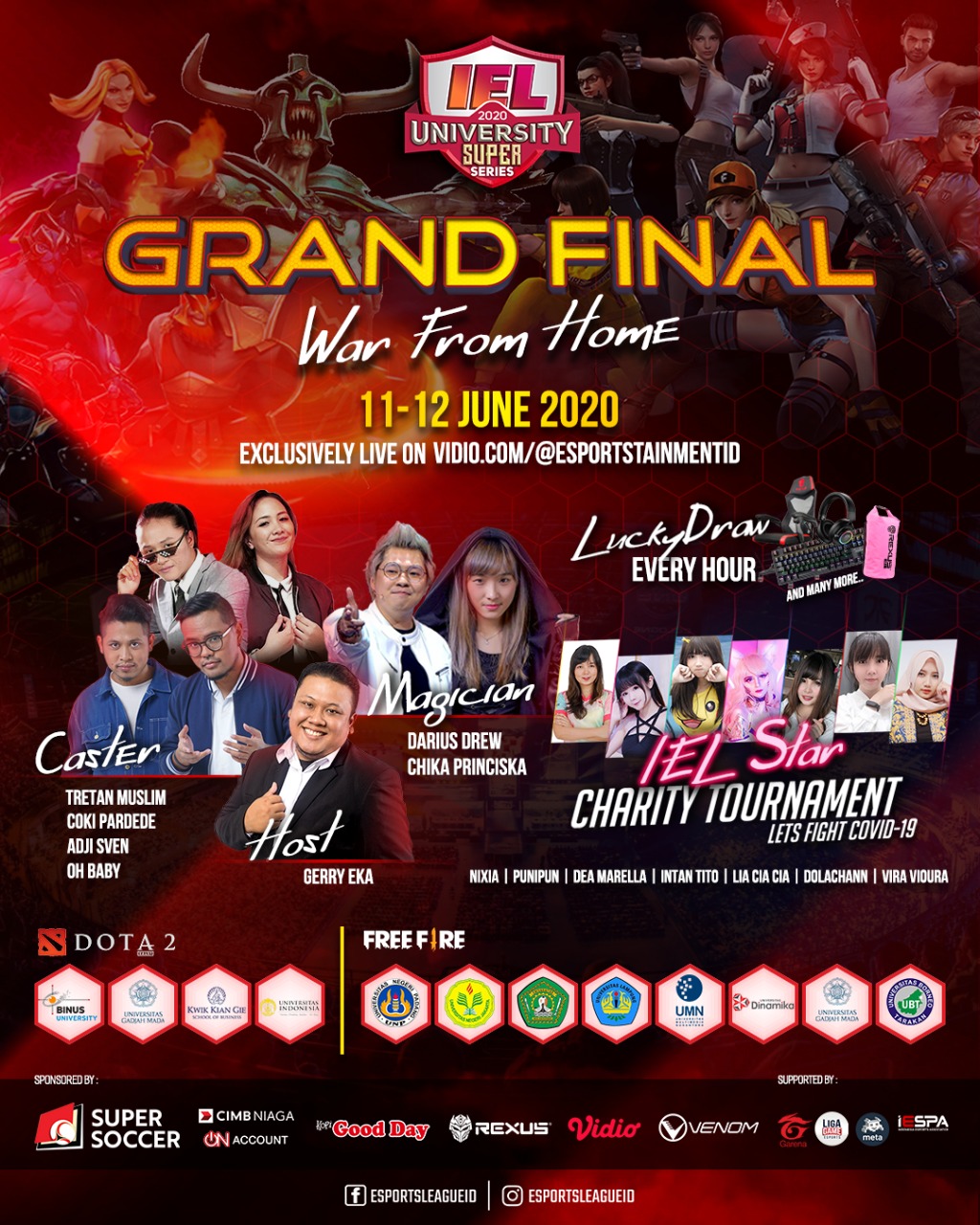 Mendukung upaya pemerintah untuk menerapkan Physical Distancing dalam mencegah penyebaran pandemi Covid-19, IEL tetap menggelar Grand Final IEL University Super Series 2020 secara online. IEL berkomitmen untuk tetap menyajikan keseruan yang terjadi di balik liga Grand Final ini untuk seluruh pecinta Esports di Indonesia. Liga Grand Final ini bisa disaksikan di aplikasi Vidio yang dapat diunduh melalui Play Store dan Apps Store atau melalui situs Vidio.com mulai 11-12 Juni 2020.