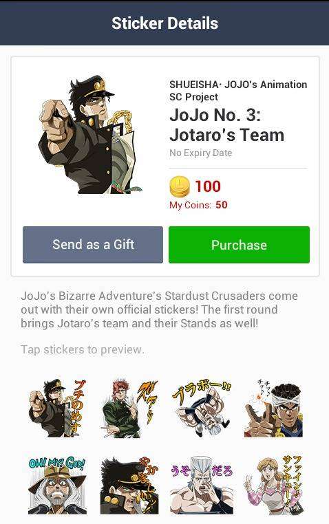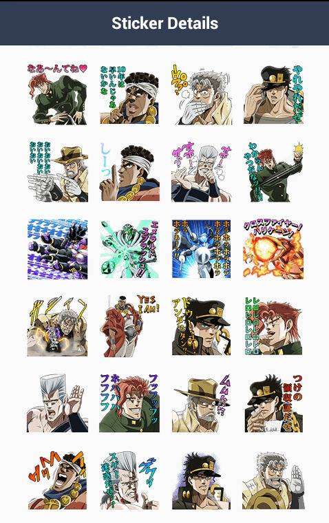 Stiker besutan Shueisha dan pihak JoJo’s Animation SC Project ini menampilkan karakter yang muncul dari seri anime JoJo’s Bizzare Adventure : Stardust Crusaders. Karakter seperti Jotaro Kujo, Joseph Joestar, beserta para tokoh lain dan Stand nya dapat membuat percakapan dengan teman anda menjadi lebih meriah. Bagi anda yang tertarik mengunduh set stiker ini, siapkan Line coin sebanyak 100 coin atau seharga $1.99 (sekitar 20 ribu Rupiah).