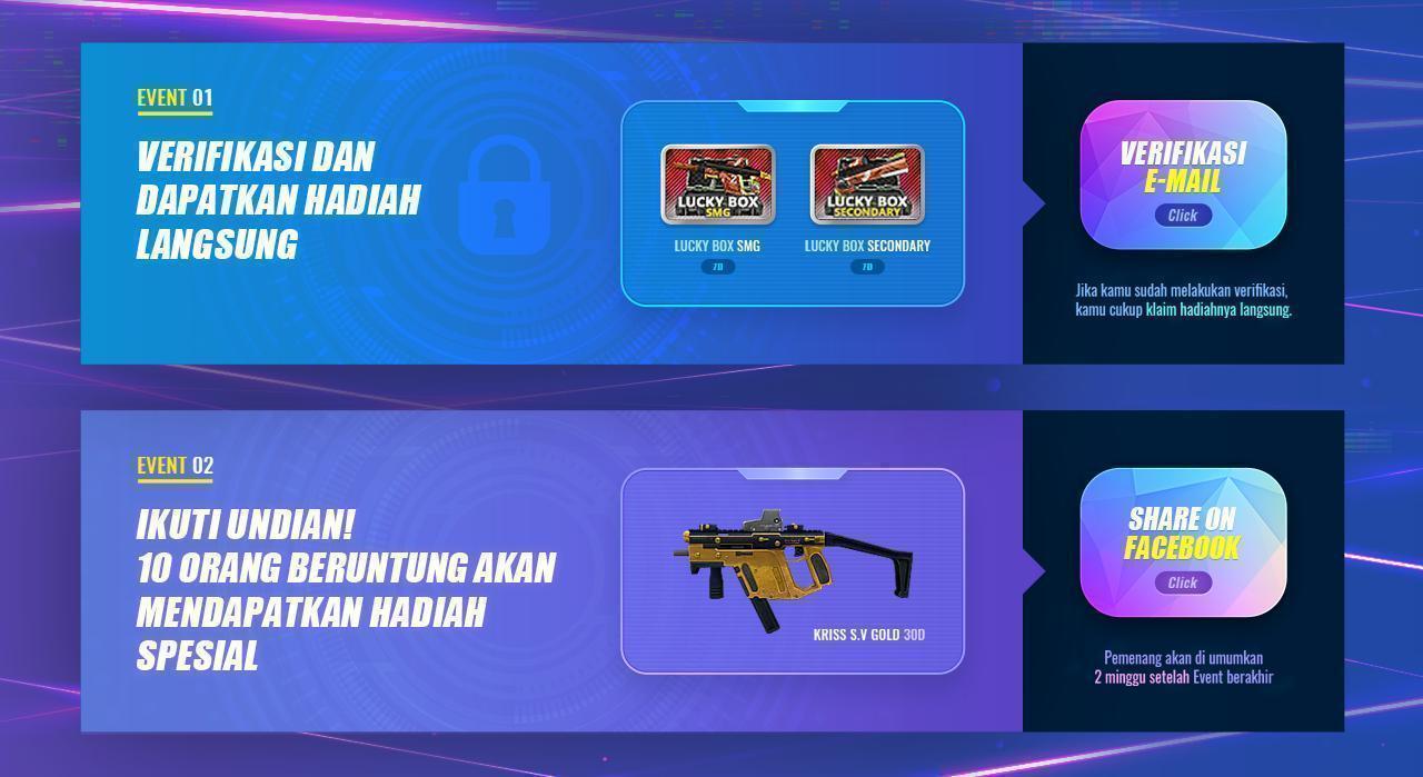 Tidak hanya itu, Point Blank sedang mengadakan event verifikasi e-mail dimana jika kamu memverifikasi e-mail kamu pada tanggal 23 Juni hingga 20 Juli 2020, kamu langsung bisa mendapatkan Random Box SMG dan Random Box Secondary. Lalu jika kamu turut mengajak temanmu untuk menverifikasi e-mailnya, kamu berkesempatan mendapatkan Kriss S.V selama 30 hari.