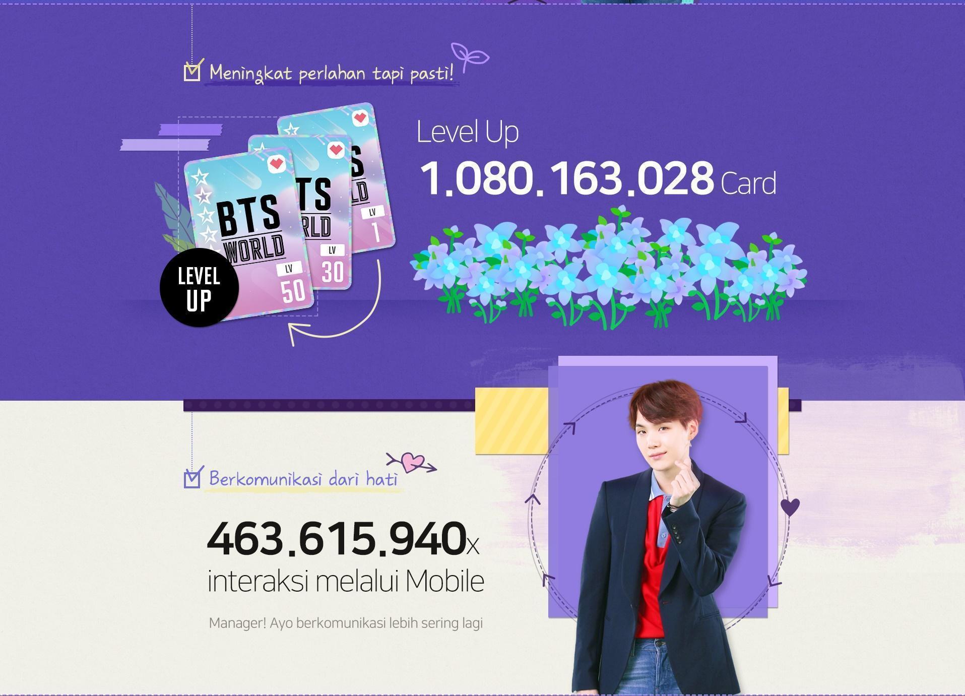 Sejak dirilis pada Juni 2019, terdapat banyak pemain dari seluruh dunia yang telah berperan sebagai Manager BTS di BTS WORLD. Hampir 400 juta komunikasi telah terhubung dengan BTS melalui fitur pengiriman pesan dalam game selama satu tahun terakhir, dan para pemain telah meningkatkan level Card lebih dari 1 miliar kali. Para Manager di BTS WORLD juga telah mendapatkan 600 juta tugas terjadwal dengan rata-rata lebih dari 1,8 juta kali per harinya, dan telah membangunkan para member hampir 100 juta kali.
