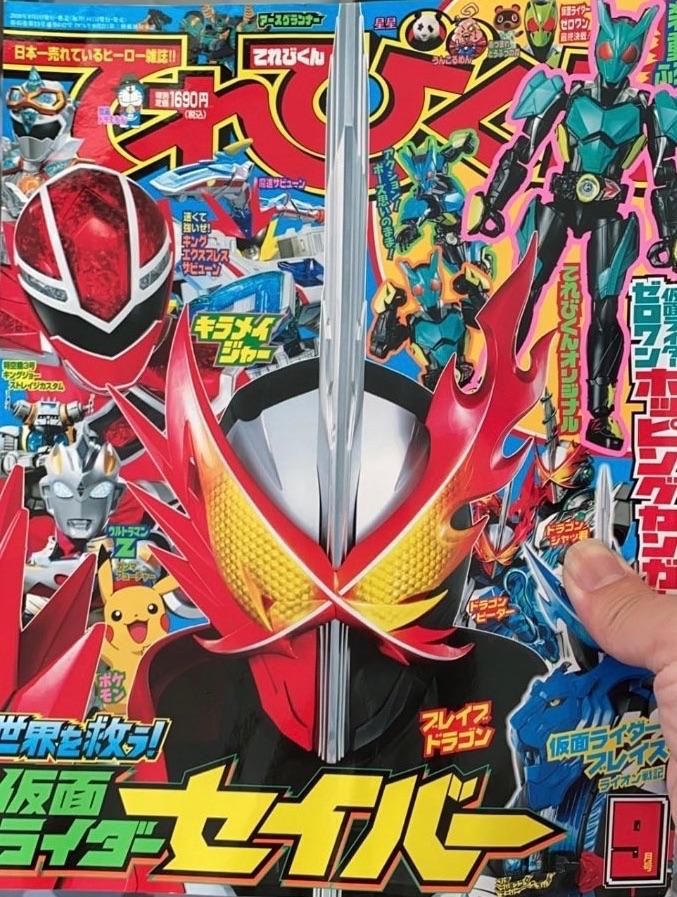 Penampilan dari Kamen Rider Saber ini disertai juga dengan penampilan form-form yang dimilikinya. Form utama Saber memiliki nama Brave Dragon dengan corak naga berwarna emas. Form-form berikutnya yang akan dikenakan oleh Saber adalah Dragon Peter dan Dragon Giant. Driver yang dikenakan oleh Saber sendiri memiliki nama Seiken Swordriver dan berbenduk pedang, dengan modul form Wonder Ride Book yang berbentuk buku. Selain Saber, terdapat juga kemunculan yang dirumorkan sebagai ‘second rider’, yaitu Kamen Rider Blaze yang berwarna biru dengan form utama Lion Senki. Halaman belakang dari majalah tersebut juga menunjukkan bentuk pedang yang akan digunakan oleh Saber dan juga bentuk Ride Book dari Brave Dragon dan Peter Fantasista.