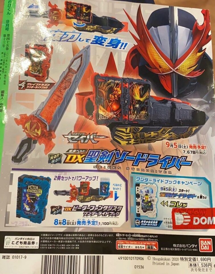 Setelah sebelumnya diumumkan bahwa Kamen Rider Saber akan menjadi judul dari serial Kamen Rider terbaru, kini akhirnya wujudnya mulai muncul ke publik. Wujud dari seri Kamen Rider kedua di era Reiwa ini muncul dalam sampul majalah mainan Televi-kun edisi September 2020. Gambar dari Kamen Rider terbaru ini juga disertai dengan sabuk driver yang dimilikinya beserta dengan alat perubahannya.