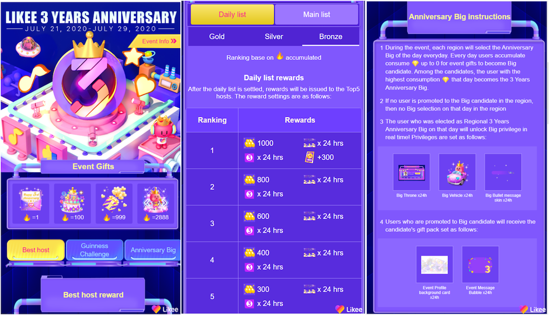 Bertepatan dengan momentum ulang tahunnya yang ketiga, Likee, platform pembuatan video pendek global terkemuka, menghadirkan Karnaval “Likee Anniversary”. Berlangsung pada 21–29 Juli 2020, karnaval ini merupakan bentuk apresiasi kepada pengguna atas kebersamaannya sebagai konten kreator di Likee. Pengguna tidak hanya dapat menikmati konten-konten menghibur, tetapi juga dapat berpartisipasi untuk membuat konten menarik.