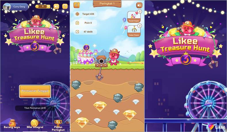 Tidak hanya mengadakan tantangan video pendek, Likee juga menghadirkan game sebagai bagian dari Karnaval “Likee Anniversary” pada corner ‘Gaming Venue’ yang bernama “Likee Treasure Hunt”. Melalui game ini, pengguna dapat menemukan harta karun berupa berlian dan berbagai item spesial Likee lainnya.