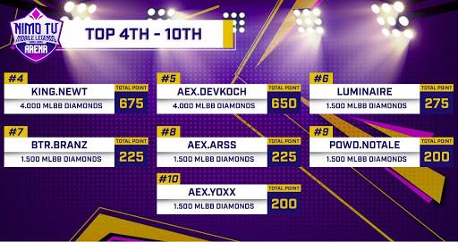 Selain uang tunai, pemain yang mencapai peringkat 4 hingga 10 NMA Star Battle berhak atas hadiah hiburan berupa Diamond Mobile Legends: Bang Bang. Detailnya bisa dilihat di bawah ini: