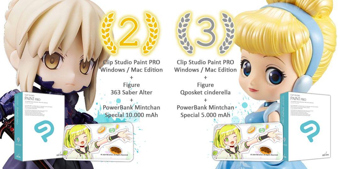 Untuk juara lomba fanart Mintchan, hadiah utama adalah Wacom Intuos Medium CTL-6100/K0-CX, lisensi Clip Studio Paint PRO (Win/Mac) dan PowerBank Exclusive Mintchan sebesar 10.000 mAh. Pemenang kedua akan mendapatkan lisensi Clip Studio Paint PRO (Win/Mac), Figure 363 Saber Alter dan PowerBank Exclusive Mintchan sebesar 10.000 mAh. Pemenang ketiga akan mendapatkan Clip Studio Paint PRO (Win/Mac), Figure QposketCinderella dan PowerBank Exclusive Mintchan sebesar 5.000 mAh.