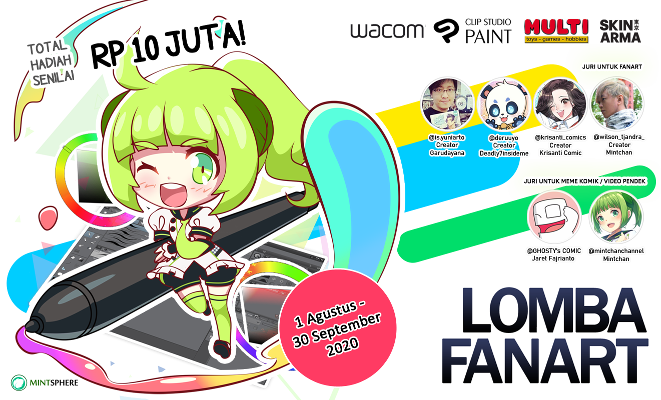 Menyambut animo para fansnya dan juga penikmat jejepangan, kini akan diadakan Lomba Fan-art dan Meme Mintchan yang terbuka untuk umum. Tak tanggung-tanggung, lomba ini akan memberikan hadiah dengan total senilai 10 juta rupiah! Selain total hadiahnya yang wow, lomba ini juga akan diramaikan oleh nama-nama yang sudah dikenal di industri kreatif tanah air sebagai sponsor dan jurinya.
