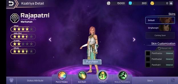 - LANA ATMA, ketika Ksatriya Rajapatni mendapatkan buff attack damage dan ada teman di sekitarnya, maka Ksatriya Rajapatni akan mendapatkan tambahan Buff attack damage dan status resist. Durasi Buff sendiri pun berlangsung selama 5-7 detik.