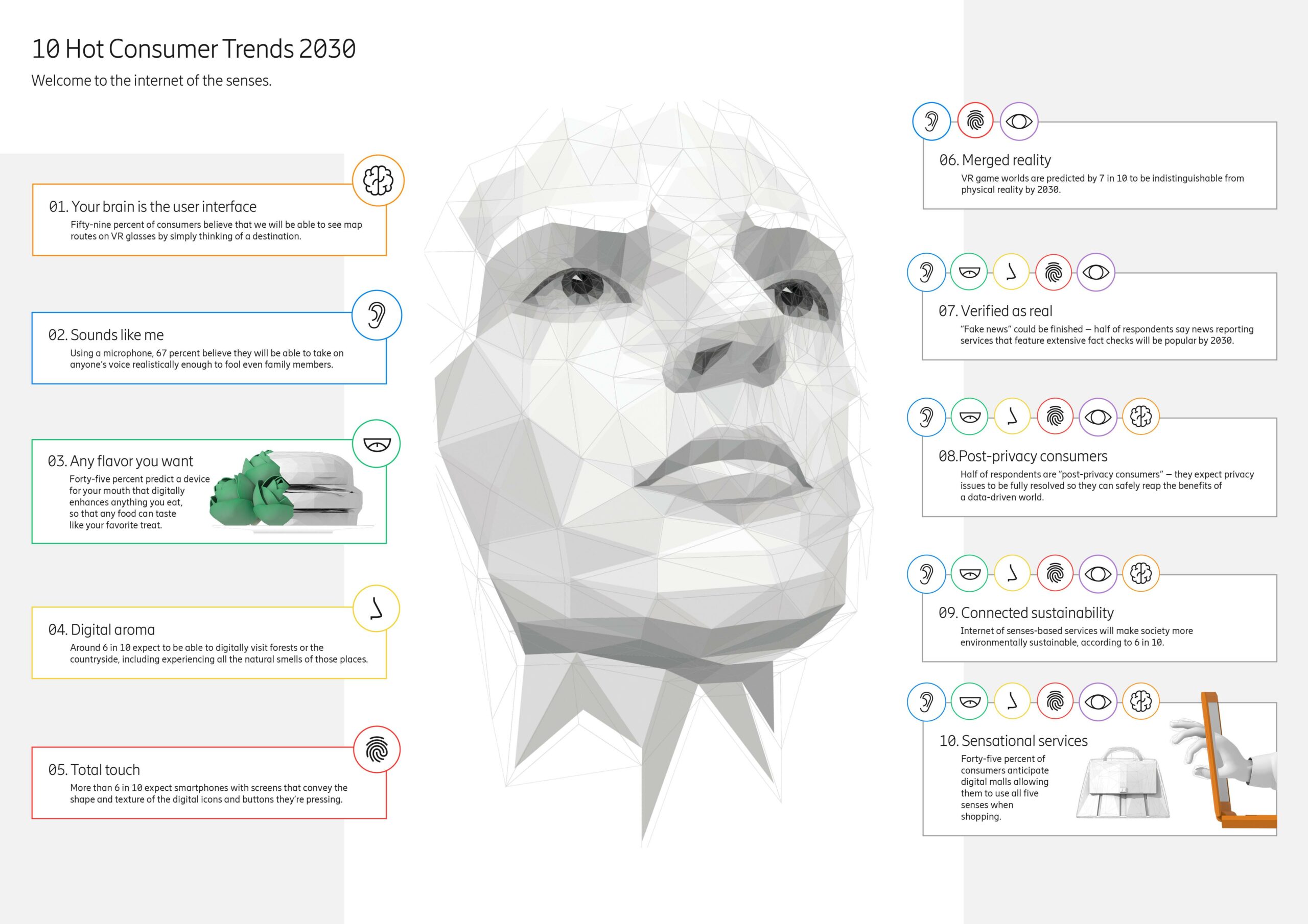 Melanjutkan poin sebelumnya, separuh pelanggan meyakini bahwa pada tahun 2030, internet yang sepenuhnya indrawi akan semakin canggih hingga ke titik di mana realitas fisik dan digital akan berbaur menjadi satu, dan teknologi dapat meniru dan memanipulasi indra manusia.