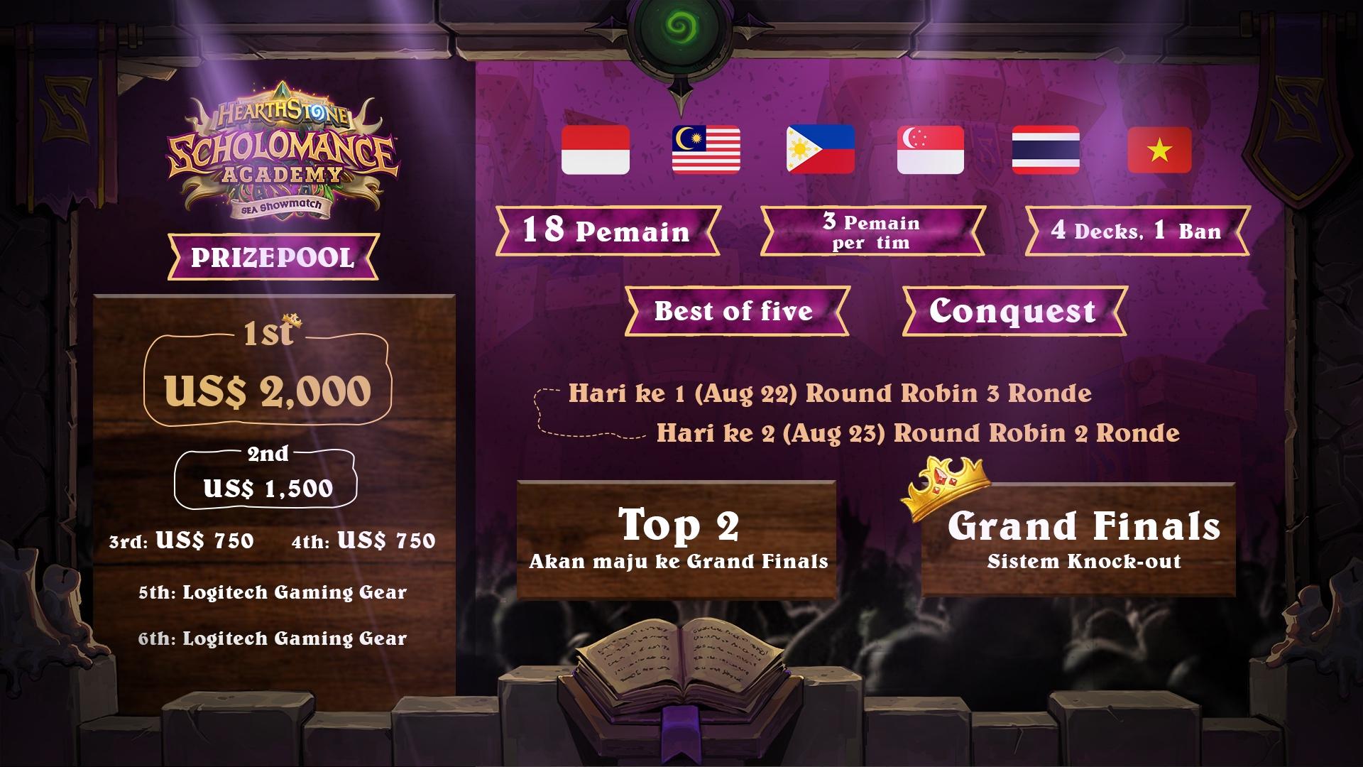 Untuk merayakan ekspansi Hearthstone Scholomance Academy yang baru diluncurkan, Blizzard Entertainment mengadakan showmatch SEA akhir pekan ini dengan enam tim dari Asia Tenggara yang mewakili negaranya masing-masing untuk memperebutkan gelar juara dan hadiah utama sebesar USD$2.000.
