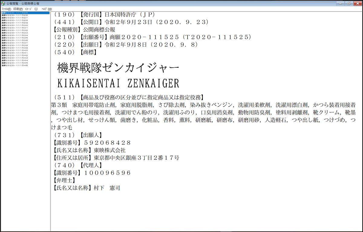 東映株式会社により「機界戦隊ゼンカイジャー / KIKAISENTAI ZENKAIGER」が商標登録出願されていることが、公開商標公報から明らかになりました。出願番号は2020-111525~2020-111546です。 pic.twitter.com/6BnsgtpAEb