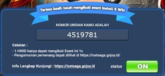 - Setelah data terkirim, akan tampil nomor undian event Install & Win. Simpan baik-baik kode tersebut.