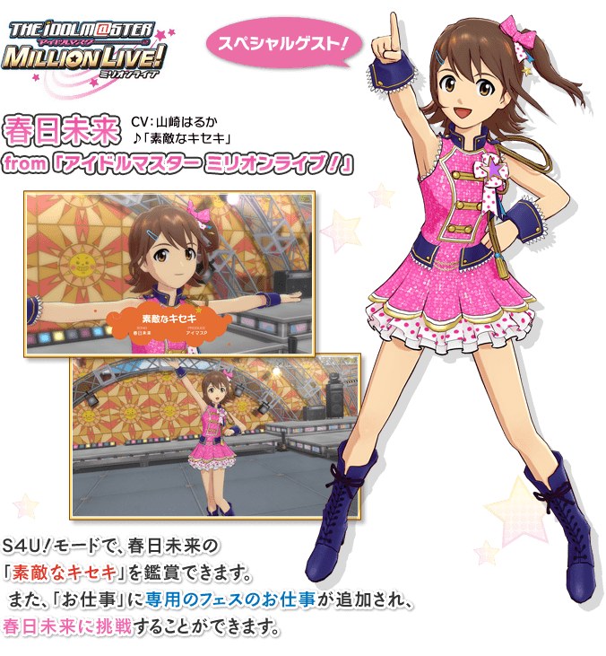 Mirai Kasuga, karakter khusus untuk game mobile dari seri The Idolm@ster, akan turut hadir dalam game PS3 The Idolm@ster One For All, dalam format Downloadable Content (DLC). Mirai Kasuga merupakan karakter keempat dari The Idolm@ster Million Live yang hadir sebagai DLC dalam game The Idolm@ster One For All, menyusul karakter Serika Hakozaki, Kana Yabuki dan Nao Yokoyama.