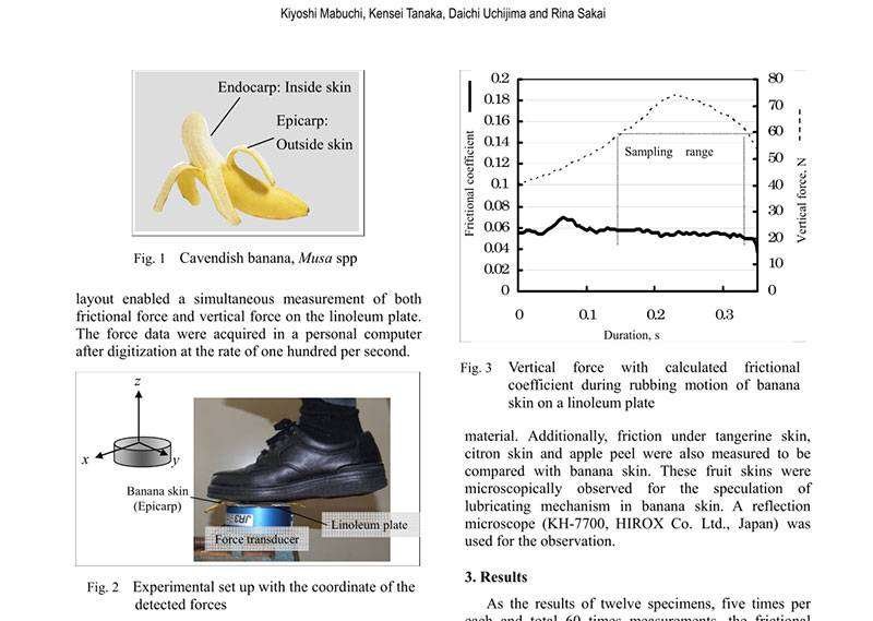 Mereka menemukan jel polysaccharide follicular, yang terkandung dalam kulit pisang, berhasil mengurangi gesekan sampai 70 persen. Dengan koefisien gesek yang sangat rendah, mereka juga berhasil menemukan bahwa orang yang menginjak kulit pisang berisiko 90% jatuh terpeleset. Menariknya, jel ini ternyata juga terkandung di dalam persambungan antar tulang dalam tubuh manusia.