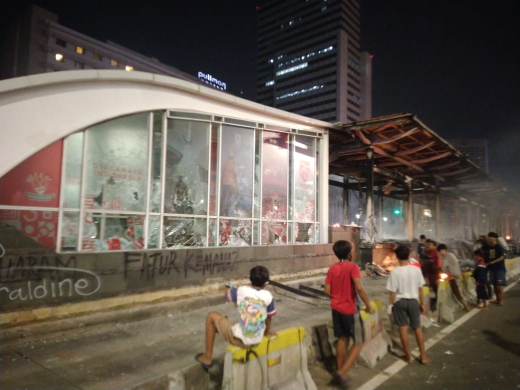 Vandalisme pada halte Bundaran HI ini pun dimulai sekitar pukul 16.30 WIB, dengan merusak Pintu Pengaman Penumpang (Platform Screen Doors/PSD). Pagar halte pun tak luput dari aksi vandalisme. Namun, hal ini menjadi liar dan mulai membakar halte Bundaran HI. Tak jauh berbeda kondisinya dengan halte Bundaran HI seperti halte Bundaran HI, halte Sarinah pun ikut Terbakar. Sementara itu untuk halte Bank Indonesia dan Tosari nasibnya masih lebih baik dibandingkan Bundaran HI dan Sarinah karena hanya mengalami kerusakan akibat vandalisme saja tanpa dibakar massa.