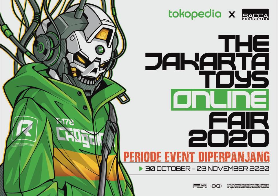 Tokopedia akan mengadakan acara Toys Online Fair terbesar di Indonesia bersama Sacca Production pada tanggal 30 Oktober – 3 November 2020 (5 hari). Di sini publik bisa belanja online Toys inceran kamu dengan harga yang oke dari seller-seller terkemuka yang sering berpartisipasi di event The Jakarta Toys & Comics Fair ini.
