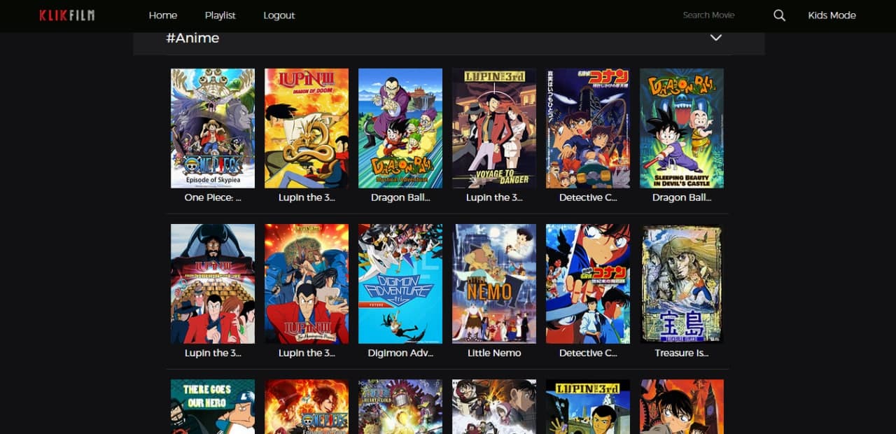 Dengan spesifikasi seperti itu, tentu saja anime-anime yang ada di Klik Film adalah film-film layar lebar, ataupun film televisi atau TV Special berdurasi 1 setengah jam atau lebih. Dan yang menjadi “andalan” dari koleksi film-film anime di Klik Film adalah Detektif Conan dan Lupin III. Di Klik Film ini pemirsa bisa menonton sejumlah judul film layar lebar Detektif Conan maupun sejumlah judul-judul dari episode TV Special dari Lupin III. Selain itu, terdapat juga sejumlah versi film layar lebar dari sejumlah anime klasik seperti The Adventures of Gamba (Gamba no Boken), There Goes Our Hero (Ganbare!! Tabuchi-kun!!), hingga Treasure Island (Takarajima). Film-film anime klasik ini sejatinya adalah versi ringkasan dari serial animenya masing-masing (seperti film layar lebar trilogi Gundam 0079 ataupun trilogi Zeta A New Translasion). Selain itu ada juga Little Nemo yang merupakan proyek kolaborasi Jepang dan Amerika.