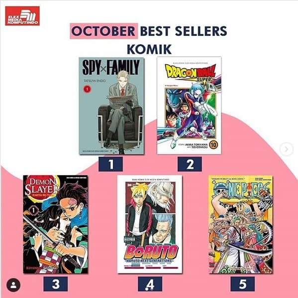 Spy x Family, komik asal Jepang tentang mata-mata ini sebagaimana telah diberitakan sebelumnya, telah diterbitkan di Indonesia oleh penerbit Elex Media Komputindo. Edisi pertama dari komik ini diterbitkan di Indonesia oleh Elex Media pada tanggal 14 Oktober 2020 lalu. Rupanya kehadiran komik ini di Indonesia disambut positif oleh publik. Terbukti, setelah baru saja terbit, komik mata-mata ini langsung menjadi komik best seller nomor satu selama bulan Oktober 2020 versi penerbit Elex Media, mengalahkan judul-judul komik populer lainnya seperti Dragon Ball Super, Boruto, One Piece, bahkan Kimetsu no Yaiba. Berikut adalah 5 komik best seller versi Elex Media pada medio bulan Oktober 2020: