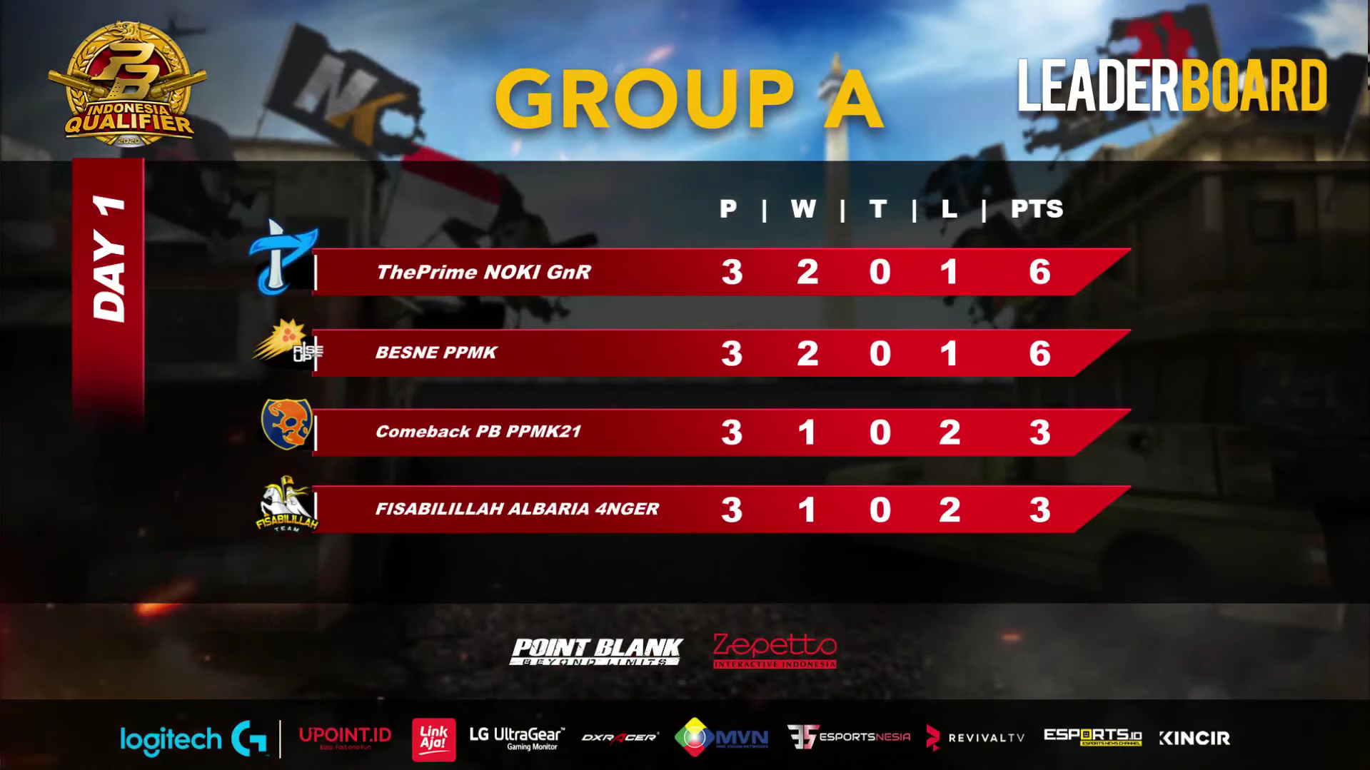 Di babak play off Point Blank Indonesia Qualifier (PBIQ) 2020 ini, sebanyak 16 tim akan bertanding untuk memperebutkan 8 slot di babak knockout. Di hari pertama, menampilkan Grup A yang mempertemukan The Prime NOKI GnR, BESNE PPMK, Fisabilillah Albaria 4NGER, dan Comeback PB PPMK.