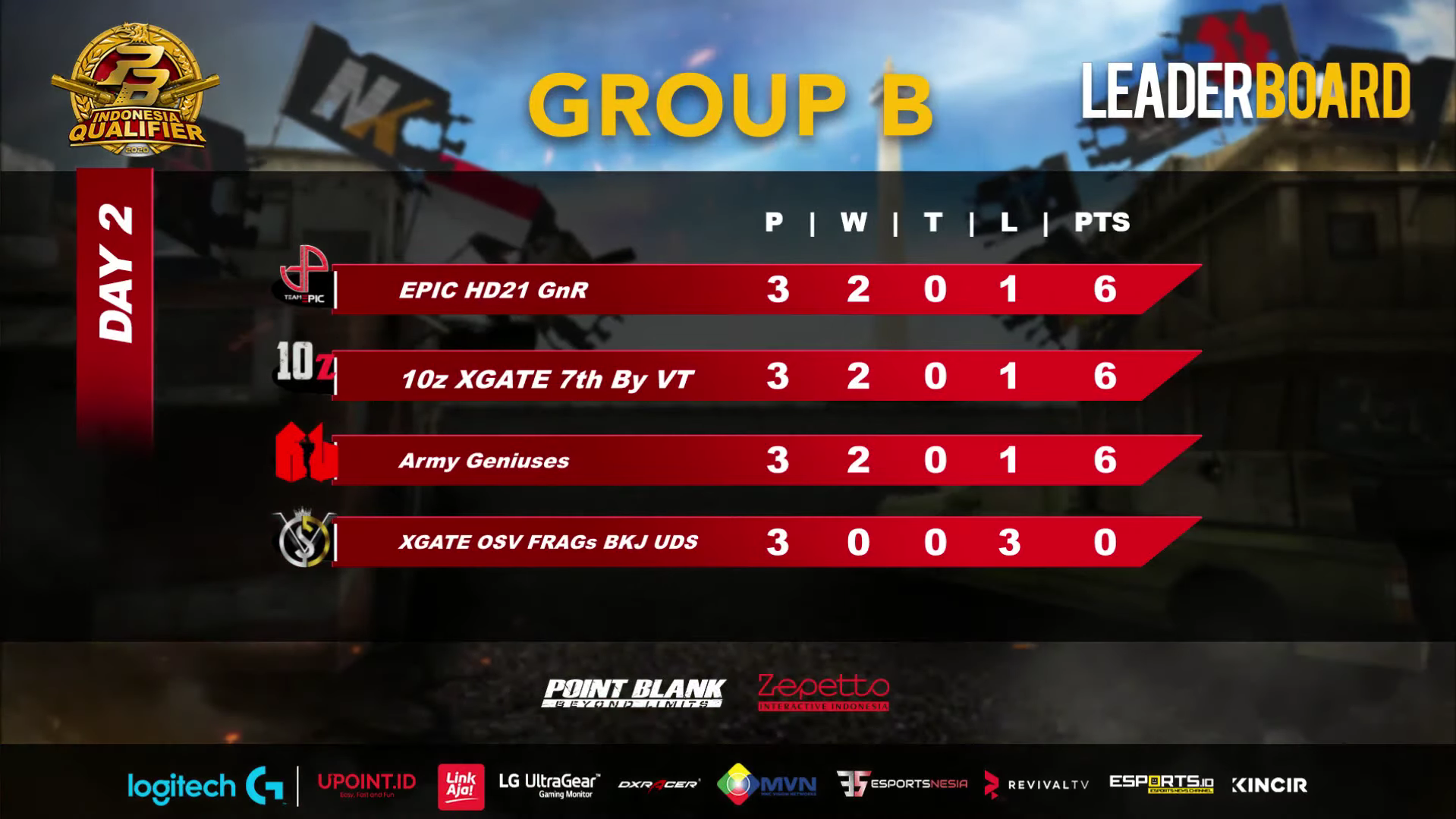 Pertandingan tak kalah seru berlangsung di grup B. Tiga tim, yakni, EPIC HD21, 10z XGATE 7th By VT dan Army Geniuses memiliki poin sama (6). Ketiganya tampil seimbang dan saling mengalahkan dalam pertandingan di grup B. Hasil akhir pun harus ditentukan lewat selisih poin round. EPIC HD21 berhasil memuncaki klasemen, sedangkan 10z XGATE 7th by VT berada di peringkat kedua.