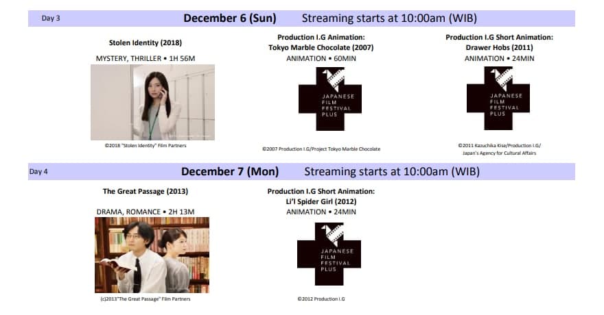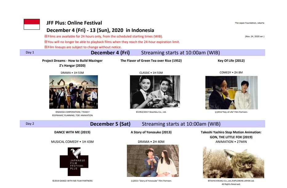 Seluruh informasi terkait skedul film dan acara lainnya dalam JFF Plus: Online Festival di Indonesia dapat diakses melalui website id.japanesefilmfest.org maupun media sosial Japanese Film Festival Indonesia.