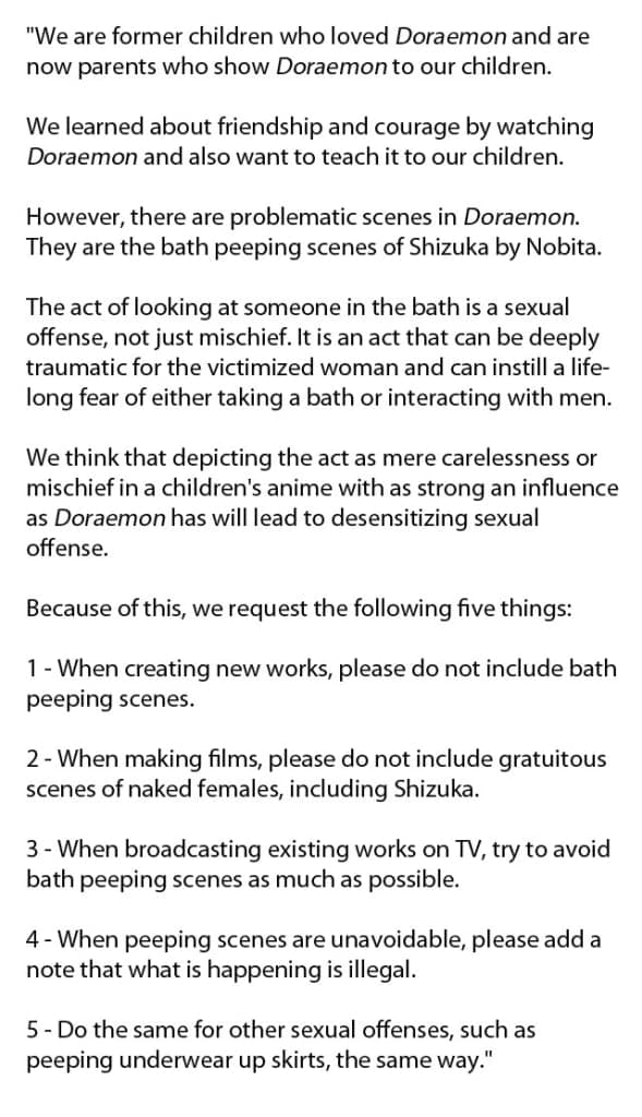 Salah satu adegan yang cukup terkenal dalam serial Doraemon, dan seringkali menjadi lelucon adalah adegan Shizuka mandi. Namun seiring berjalannya waktu, rupanya mulai ada sejumlah kalangan fans yang tidak nyaman dengan adegan ini, dan menganggapnya sebagai sebuah pornografi yang tidak seharusnya ada dalam seri hiburan keluarga seperti Doraemon. Atas dasar kegelisahan itulah, seorang warganet asal Jepang bernama Midorino Mushima membuat petisi online di Change.org yang meminta dikurangi atau bahkan dihilangkannya adegan Shizuka mandi, dan sejumlah adegan lainnya yang dirasa tak senonoh seperti adegan telanjang ataupun rok terangkat dalam episode-episode terbaru Doraemon.