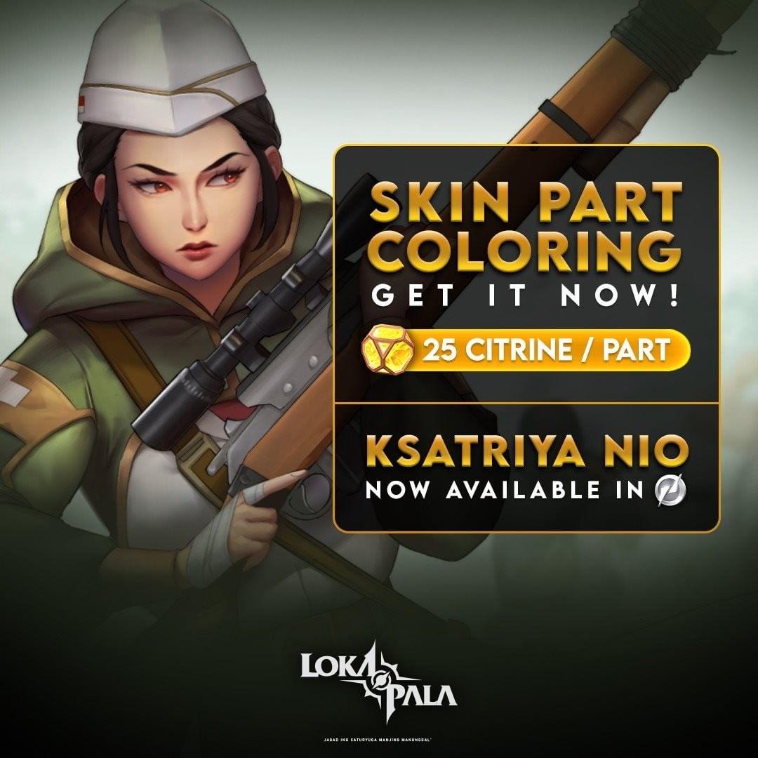 Salah satunya adalah skin part coloring untuk Ksatriya Sabara dengan nama skin Cerberus, Ksatriya Vijaya dengan nama skin Krtarajasa dan Ksatriya H’rtal dengan nama skin Smokestack Outburst. Skin part coloring tersebut bisa kamu dapatkan dengan menukarkan 25 Citrine/Part.