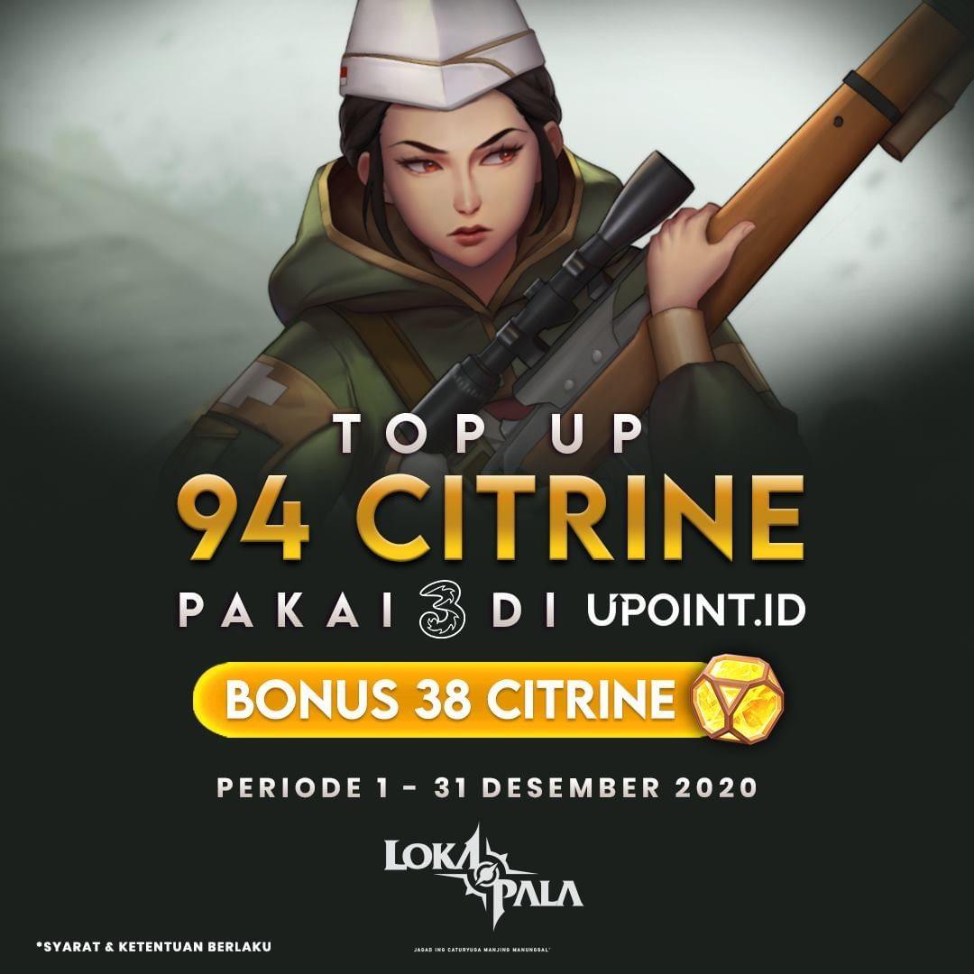 Yups, untuk kamu yang top up Citrine Lokapala di UPoint, maka kamu berhak mendapatkan bonus Citrine Lokapala. Promonya adalah dengan membeli 94 Citrine Lokapala di UPoint.id pakai kartu Three (3) dan XL maka kamu berhak mendapatkan bonus 38 Citrine Lokapala. Promo ini hanya berlaku sampai tanggal 31 Desember 2020 ya.