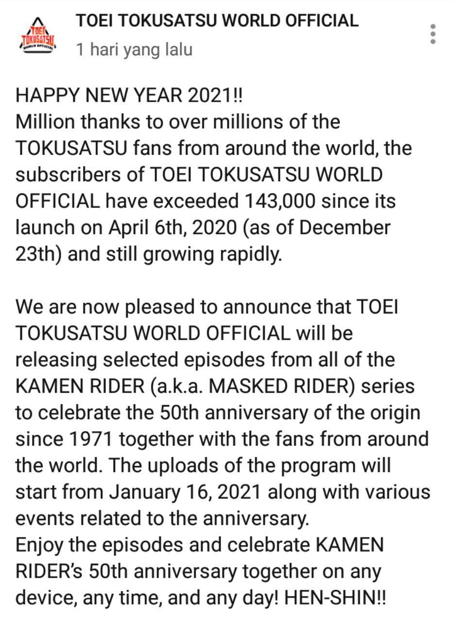 Memasuki tahun 2021, seri franchise Kamen Rider buatan dari Ishimori Production dan Toei Company ini akan siap memperingati hari lahirnya yang pada tanggal 03 April 2021 nanti akan berusia 50 tahun sejak dimulai pada tahun 1971 lalu. Sebagai bentuk ucapan syukur dan sekaligus memperingati perayaannya yang ke-50 ini, Toei pun secara resmi mengumumkan akan membawa seluruh Seri Kamen Rider dengan episode pilihan ke channel Youtube resminya secara global di Toei Tokusatsu World.