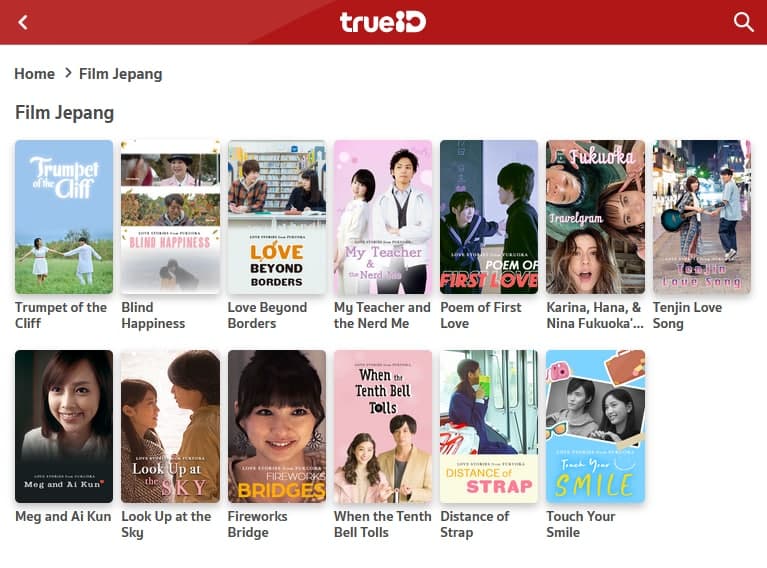Tak lupa, TrueID juga turut menyiarkan sejumlah judul anime Jepang yang sudah bisa ditonton melalui layanan streaming ini. Selain itu, dengan fokusnya pada film dan serial Asia, rupanya mereka juga memiliki sejumlah koleksi film-film Jepang dalam layanan streaming mereka. Setidaknya saat ini telah tersedia 13 judul film asal Jepang yang sudah bisa ditonton melalui layanan mereka. Film-film tersebut di antaranya adalah Trumpet of the Cliff, Blind Happiness, Love Beyond Borders, My Teacher and the Nerd Me, Poem of First Love, Tenjin Love Song, Karina, Hana, & Nina Fukuoka’s Travelgram, Meg and Ai Kun, Look Up at the Sky, Fireworks Bridge, When the Tenth Bell Tolls, Distance of Strap, Touch Your Smile.