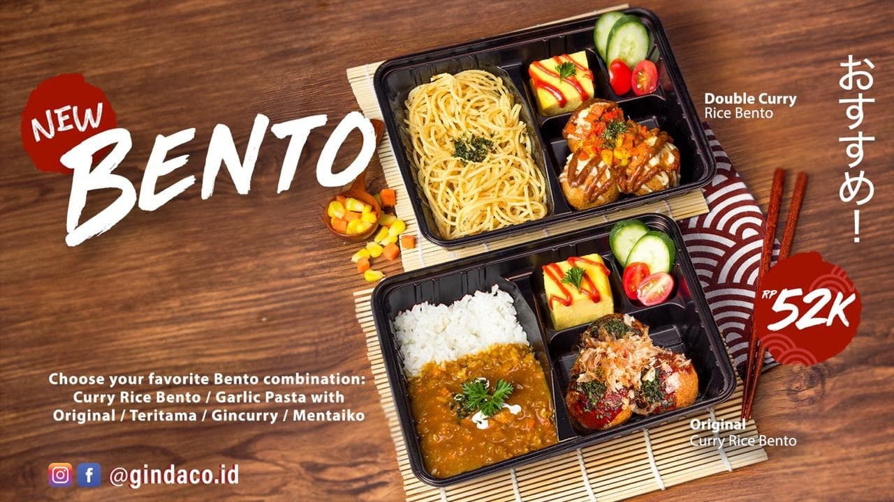 Nasi Jepang di balur dengan cita rasa otentik kari Jepang di padu dengan tamagoyaki, timun kyuri, ceri tomato, dan Takoyaki dengan 4 pilihan rasa Takoyaki, yaitu Curry, Original, Teritama dan Mentaiko Cheese