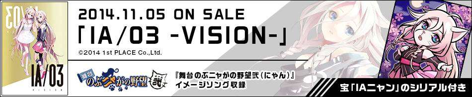 Fans Vocaloid IA yang sudah memesan album IA 03 -Vision-, rilis 5 November, kembali dimanjakan dengan promo spesial. Album tersebut akan memiliki bonus DLC serial code terbatas dari karakter IA dalam game ‘Nobunyaga no Yabou‘. Nobunyaga no Yabou sendiri merupakan game RPG online mengoleksi tokoh sejarah Jepang dalam bentuk kucing. Untuk kemunculan IA dalam game tersebut penampilannya pun disesuaikan sebagai berikut, tak lupa dengan nama ‘IA-nyan’.